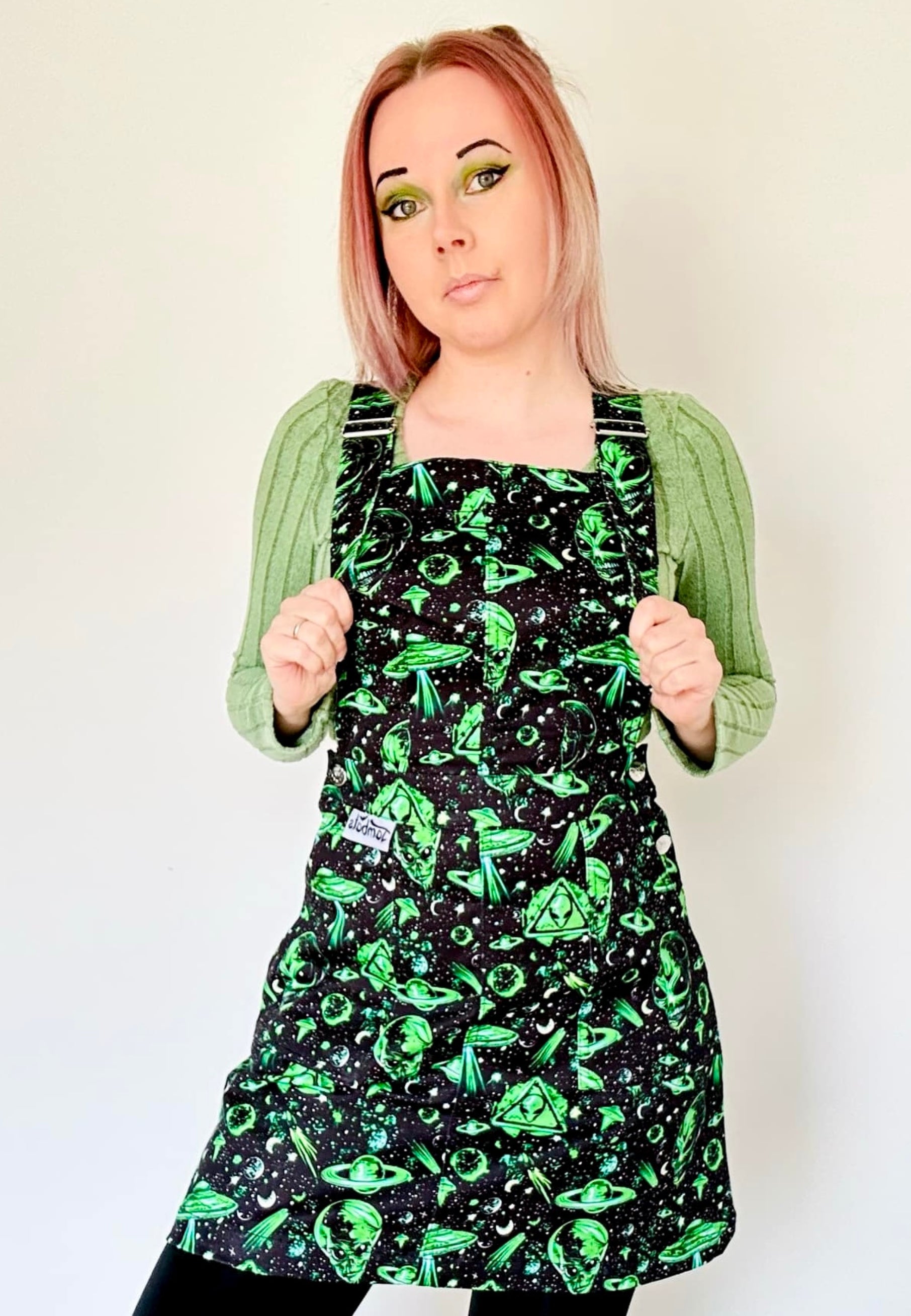 The aliens have landed 👽 Our dynamic Extraterrestrial print in a soft stretch cotton twill pinafore dress is out of this world 🛸