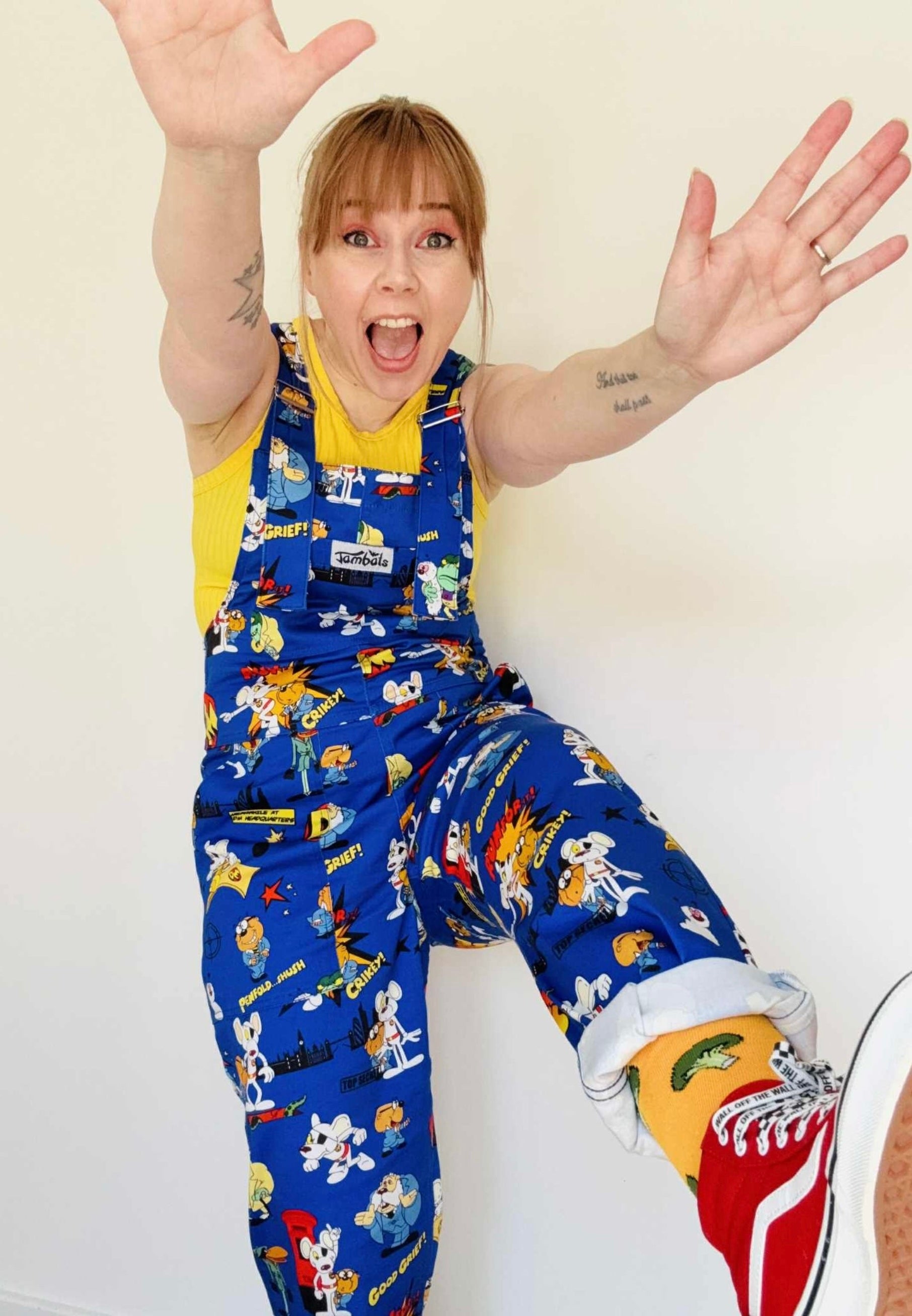 Nostalgic trip back to the 80s with everybody's favourite British spy DangerMouse and his adorable but anxious assistant hamster Penfold. Officially licenced Jambats v DangerMouse dungarees in soft stretch cotton twill.