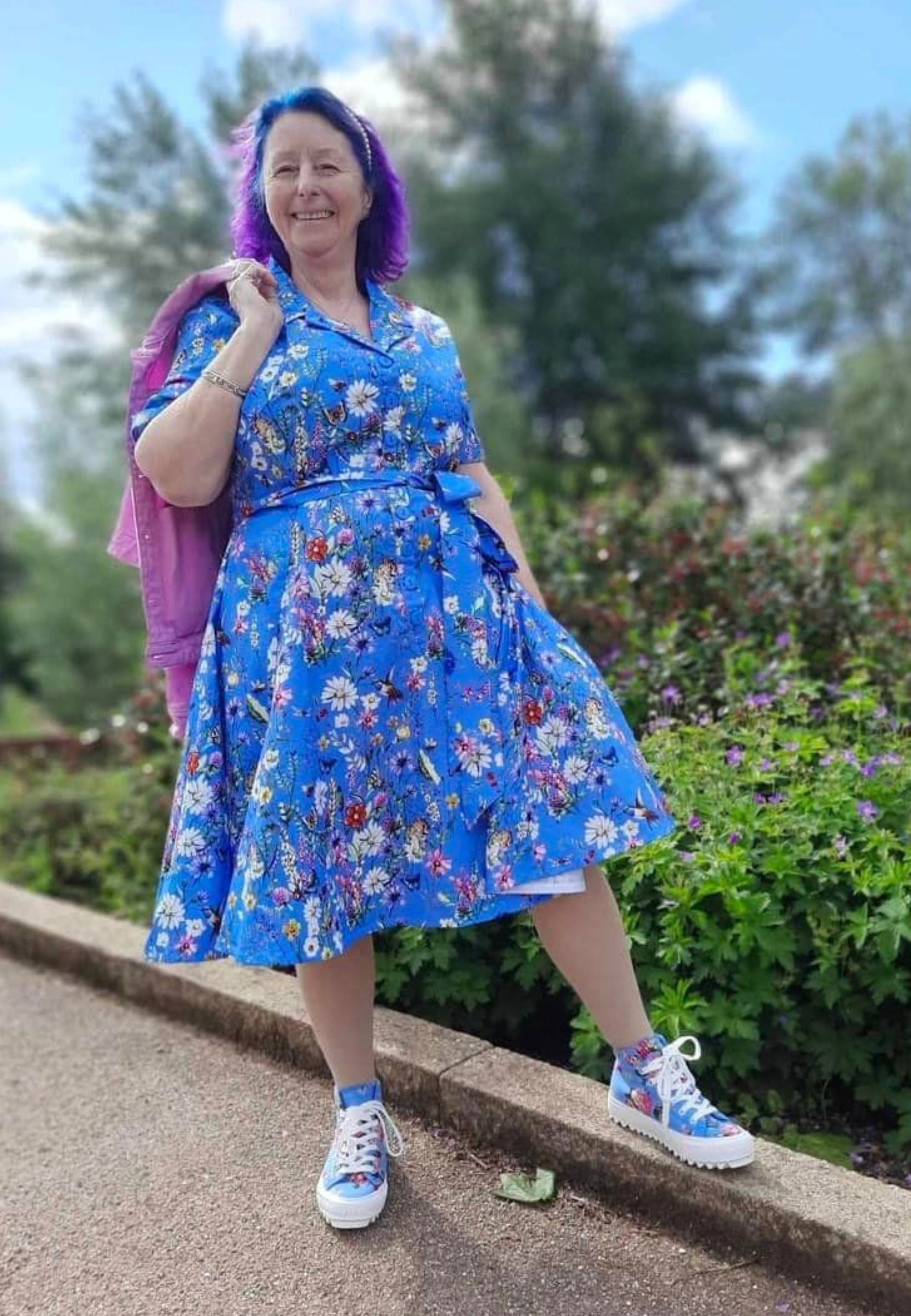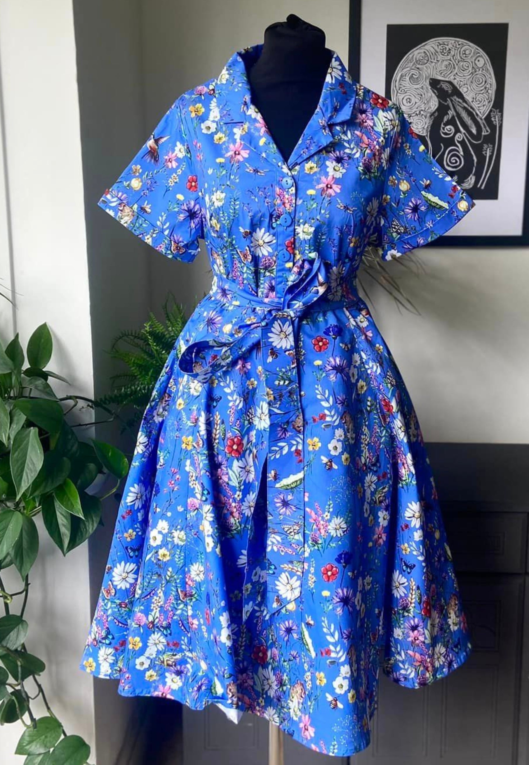 Our striking Wild Meadows Retro Shirt Dress on a vibrant cornflower blue. Messy wild flowers, insects, birds, field mice and frogs make up our summer print in a soft stretch cotton dress.